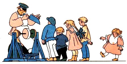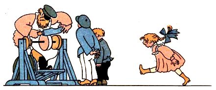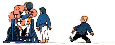 Вдруг видит-стоит во дворе точильщик, ножи точит. Ногой-раз-раз-покачивает, ремень скользит, точильное колесо вертится, от колеса-искры золотые, а нож о колесо-ззз-дзз – звенит.