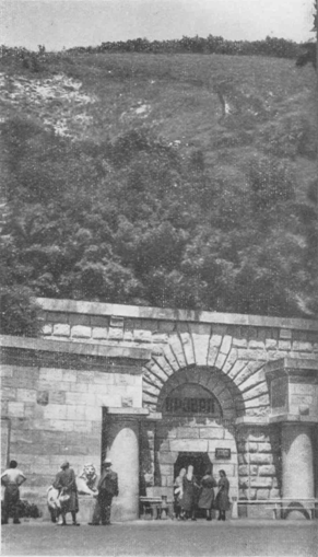 Большой известностью в Пятигорске пользуется Провал.* При подходе к нему перед посетителями открывается ровная асфальтированная площадка, с одной стороны окаймленная высокой опорной стеной из тесаного камня, а с другой заканчивающаяся крутым обрывом – спуском к подножию Машука. В центре опорной стены небольшая арка – начало 43-метрового тоннеля к подземному озеру. С запада к району Провала примыкают корпуса санатория «Машук». Внизу, на южных склонах горы, раскинулись прекрас ные здания недавно построенного санатория имени XXII съезда КПСС.
