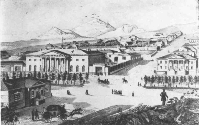 В самом центре Пятигорска* стоит красивое здание с шестью стройными колоннами из тесаного камня. В лермонтовское время это было лучшее строение города. Называлось оно гостиницей Найтаки (по имени ее содержателя) или – ресторация. Построено здание в 1828 году братьями Бернардацци по проекту архитектора Шарлеманя.