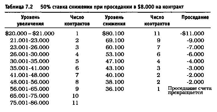 Таблица 7.2 показывает те же самые уровни увеличения числа контрактов, что и таблица 7.1, но вычисленные с помощью метода фиксированных пропорций. Таблицы увеличения и снижения представлены для дельты 1.000 долларов, начиная с баланса счета в 20.000 долларов. Кроме того, ставка снижения, представленная в таблице 7.2, в два раза превышает темпы роста риска.