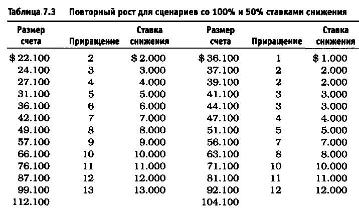Это основное преимущество более высокой ставки снижения. Однако чтобы получить полную картину, мы должны посмотреть, что случится, если после проседания в 8.000 долларов на контракт последует рост на 12.000 долларов. В случае, когда ставки увеличения иснижения одинаковы, баланс счета возрастает с 20.000 долларов до 80.100 долларов, а затем падает до 22.100 долларов. Теперь период убытков закончился, и счет вырастает на 12.000 долларов, прирост обеспечивается по 1.000 долларов с каждого контракта, как показано в таблице 7.3.