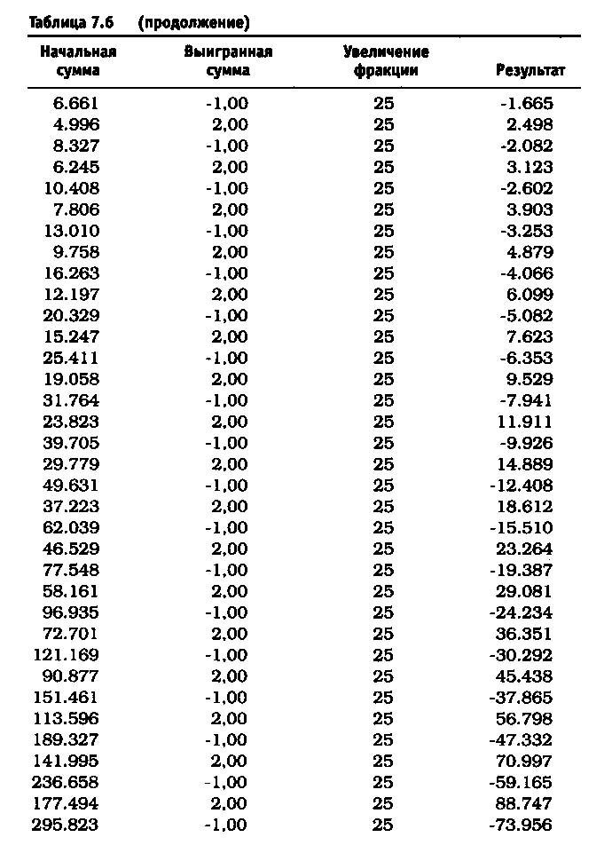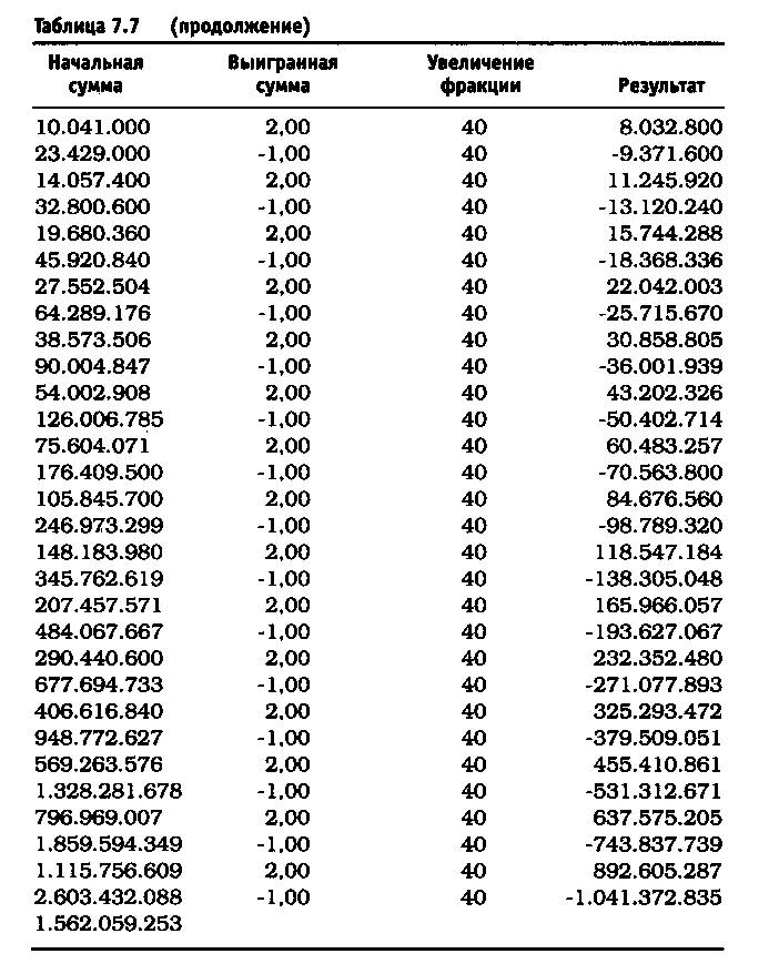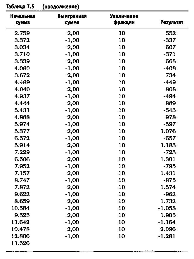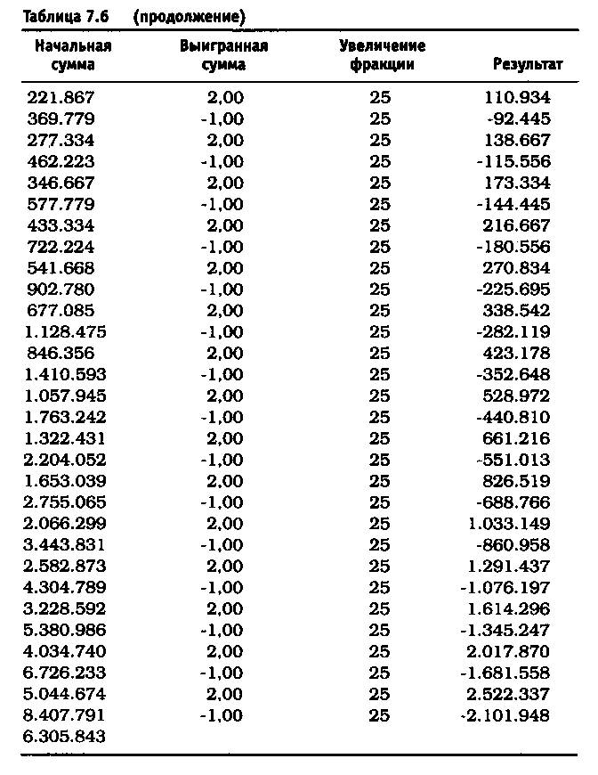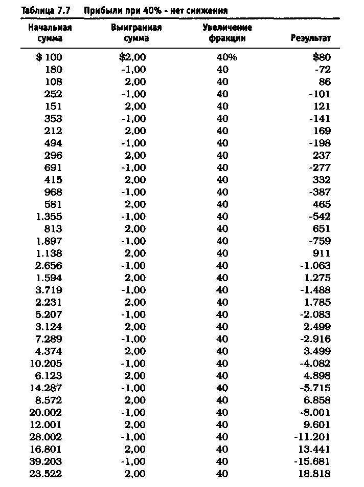 После удаления асимметричного действия рычага из уравнения реинвестирование 10% привело к росту до $11.526 долларов против $4.700 (см. таблицу 7.5). Риск в размере 25% по каждой сделке без снижения этого значения привел к тому, что оцениваемая величина возросла до $6.305.843 по сравнению с $36.100 (см. таблицу 7.6). Обратите внимание, что результаты работы не описываются гауссовой кривой, характерной для асимметричного действия рычага. При 40% прибыль получается не ниже, чем при 25%, и составляет 1.562.059.253 доллара (см. таблицу 7.7). Таков потенциал возможностей управления капиталом после устранения асимметричного эффекта рычага. Однако здесь есть одна ловушка. Эти результаты действительны при условии, что за каждым проигрышем следует выигрыш, а за каждым выигрышем – проигрыш. Используя этот метод и рискуя 25% от размера счета, через четыре проигрыша подряд вы будете вынуждены ликвидировать счет. Две потери подряд при риске в 40 долларов (или 40% от первоначальной суммы капитала) сделают невозможным придерживаться ставки пари в 40 долларов при третьем подбрасывании монеты, поскольку у вас на счете останется только 20 долларов. Этот пример -лишь схематичная иллюстрация и не более того.
