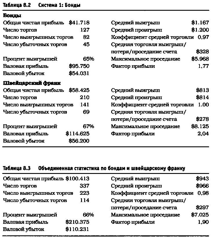 Теперь мы применим ту же логику к реальным рыночным инструментам. Первым будет рынок бондов. Вторым -рынок швейцарского франка. На обоих рынках используется одна и та же система в течение одного и того же временного периода. Статистика по каждому рынку в отдельности приведена в таблице 8.2.