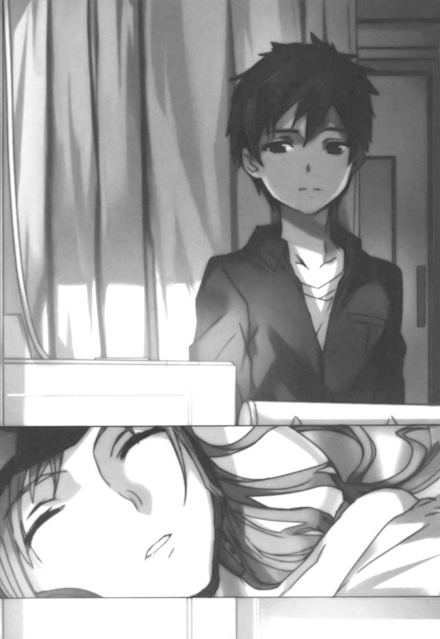 Сугуха в своем воображении прекрасно видела эту картину. Кадзуто сидит перед этой спящей девушкой, держит ее за руку, совсем как Сугуха держала его, неустанно зовет ее. Когда она представляла себе это, какое-то неописуемое чувство всплывало внутри ее сердца. Ее грудь стягивало, каждый вздох отдавался болью. Она крепко сжимала себя руками и сидела прямо – прямо там, где была.