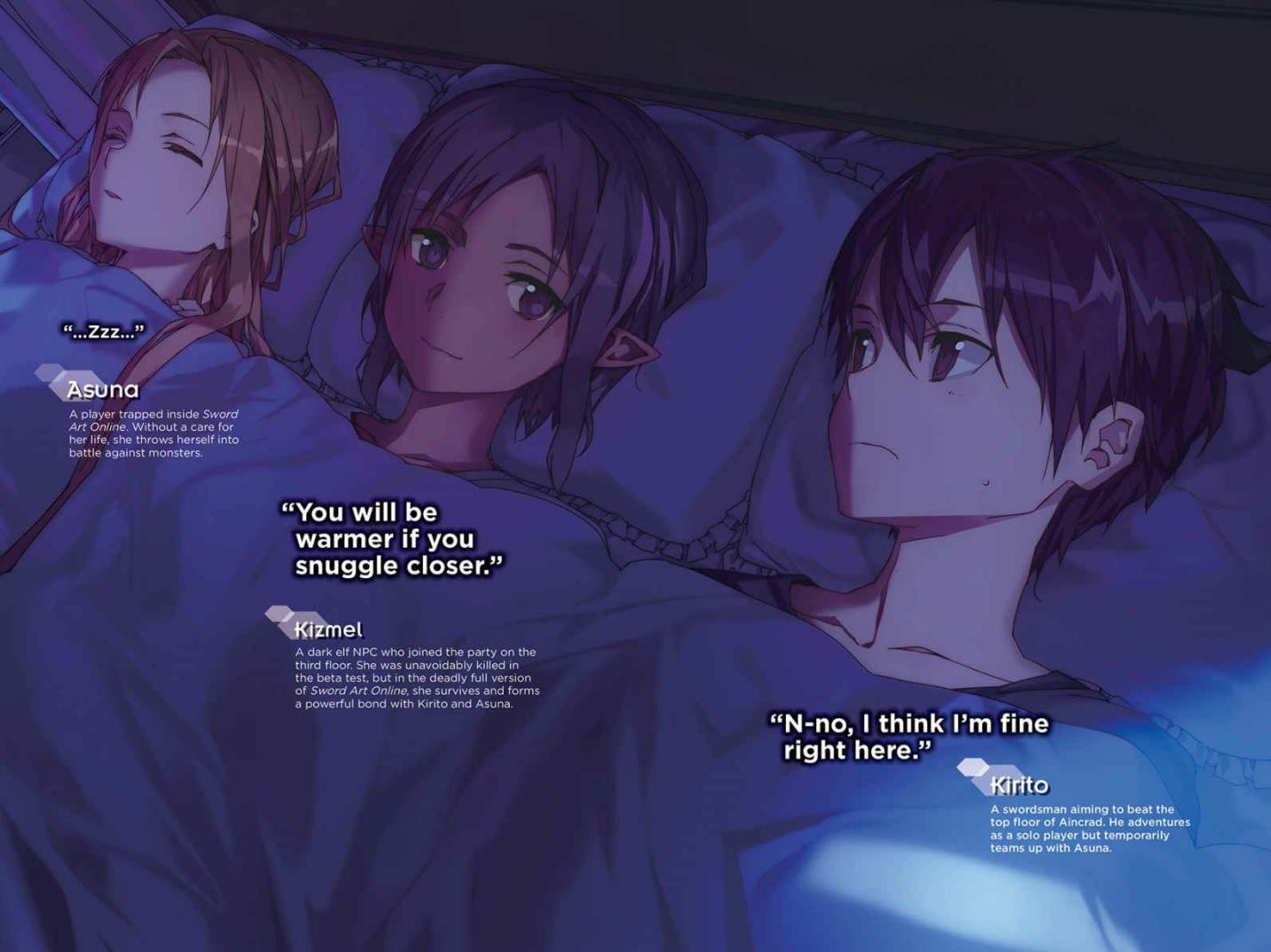 Нам пришлось обсудить, как мы расположимся в постели, и все согласились с тем, что Кизмель ляжет посередине, Асуна будет слева, а я справа. Я беспокоился о количестве свободного места, но Асуна и Кизмель легли поближе, оставив мне чуть меньше метра постели.