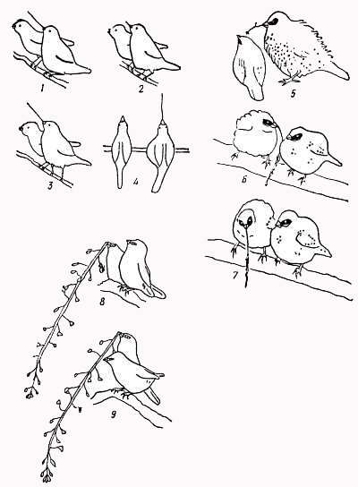 1–4 – у Estrilda, Lagonosticta и Euodice; следует обратить внимание на различное положение лапок в трех позах (1–3); 5–7 – то же подношение у Amandava amandava (5 – самец с взъерошенными перьями подносит веточку самке; 6 и 7 – самка подносит веточку самцу); 8 и 9 – такой же церемониал у Lagonosticta саеrulescens: птицы обоих полов подносят друг другу веточку, причем тот, кому делается подношение, довольно низко кланяется (9) (по Кункелю).