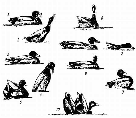 1 – покачивание клювом; 2 – клюв обращен кверху; 3 – помахивание хвостом; 4 – «свистящее урчание» (grunt-whistle); 5 – голова – вверх, хвост – вверх; 6 – самец поворачивается к самке; 7 – плавание с клювом у поверхности воды; 8 – самец отворачивает голову и показывает свой зеленый воротник; 9 – самец выпячивает грудь колесом; 10 – покачивание взад и вперед (по Рамзею).