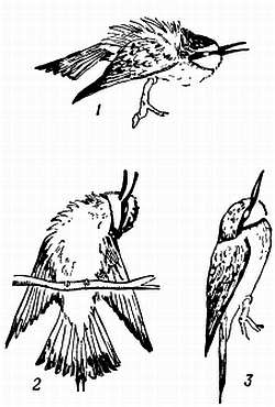 1 – «дождевая ванна»; перья взъерошены, клюв полураскрыт, глаза закрыты; 2 – солнечная ванна; 3 – другая поза под дождем (по Кёнигу).