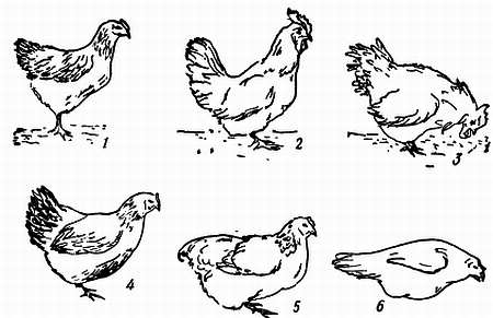 1 – поза доминирования, голова выпрямлена, перья слегка топорщатся; 2 – поза доминирования у петуха (отметить полусогнутые ноги); 3 – очень агрессивная поза; 4 – у курицы эта поза с полусогнутыми ногами означает, что она включается в стадо и не имеет каких-либо агрессивных намерений, в противоположность позе 1; 5 – поза подчинения; 6 – самка в приглашающей позе (по Формену и Элли).