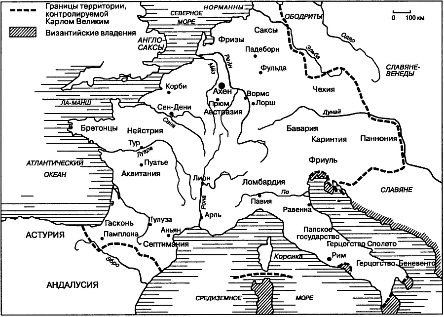 Итальянское королевство было присоединено к королевству франков, и в нем были приняты франкские законы. Тем не менее на его территории образовалось особое владение, где управлял собственный король и продолжали сохраняться местные традиции. Среди вновь завоеванных земель это единственный пример такой автономии. Рим, память об империи, сокровища художественной культуры, соседство с Византией – все это объясняет особое положение, занимаемое королевством Италии. Карл Великий победил лангобардов, однако главный успех его заключался не столько в покорении этого народа, сколько в завоевании Италии. Организационное устройство созданного им государства пришлось королю по душе, и он использовал уже оправдавшую себя структуру при создании королевства для своего малолетнего сына Людовика, а именно королевства Аквитанского, простиравшегося от Луары до Роны. Аквитания, область с античными традициями, получила собственного короля; впрочем, последний уже в силу своего юного возраста (ему исполнилось три года) находился в полной зависимости от отцовской власти.