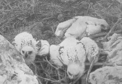 Мы увидели среди кварцевых глыб громадное, неряшливо сплетенное из прутьев тала, стеблей тростника и тряпок гнездо. В нем сидели три белых с черными пятнами птенца величиной с курицу. Здесь же лежала голова суслика.