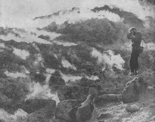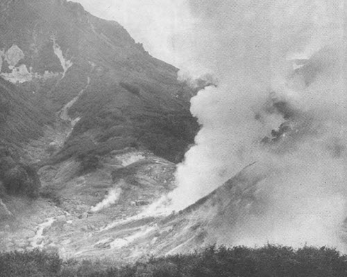 Активные участки вулканов Менделеева и Головнина относятся к сольфатарным. Здесь господствует сера. Она всюду: в воздухе и воде, скрипит под ногами, почва на сотни метров вглубь сплошь состоит из серы. Насыщенный серой горячий поток газа с бешенством и рычанием вырывается из бездонных провалов; ветер то пригибает его к земле, то милостиво разрешает клубами подниматься вверх. И горе всему живому, когда его внезапно окутает столб белого газа, несущий удушье.