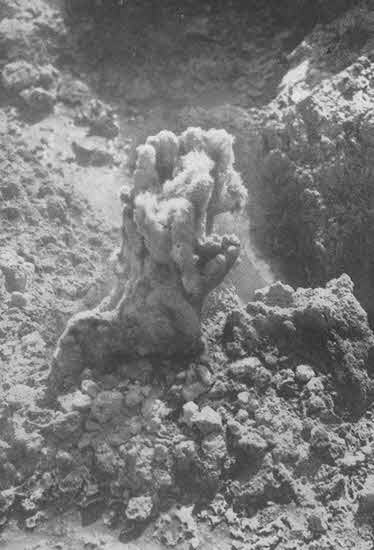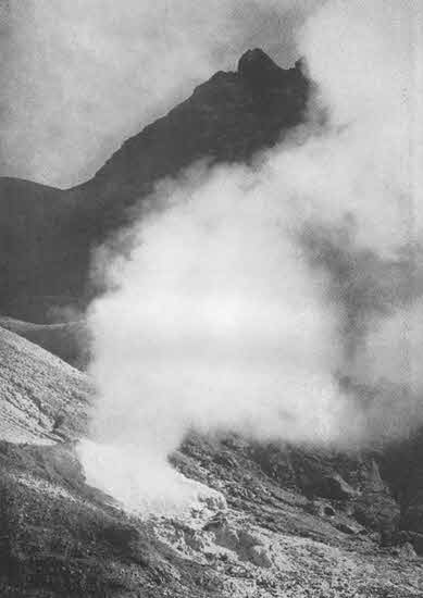 Все щели и разломы в породах оторочены серой. Она образует изящные фигурки, трубки-конусы, которые растут до тех пор, пока не разрушатся под собственной тяжестью. Из всех отверстий таких трубок со свистом выделяется удушливый газ, покрывающий их ярко-желтой щеткой кристаллов серы.