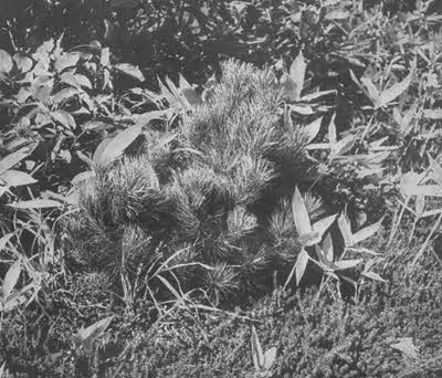 Кедровый стланик (Pinus pumila), образующий непроходимые заросли. Рядом – низкорослый курильский бамбук
