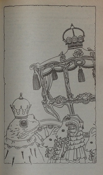 Не требуя, чтобы её сопровождали, и не ожидая этого, прекрасная королева Луиза повернулась, слегка поклонившись, и направилась к двери, она прошла через здание монастыря обратно во двор и оттуда – к карете. Сев в карету, она в задумчивости насупилась и снова превратилась в жабу. За ней в карету сели три барана и следом – дочь королевы Луизы, Мюриэл, а потом – его величество король и фрейлина её величества. Раненые рыцари построились за каретой, чтобы сопровождать их домой. Из-за того что в карете теперь оказалось на два человека больше, трое баранов были так зажаты, что едва дышали.