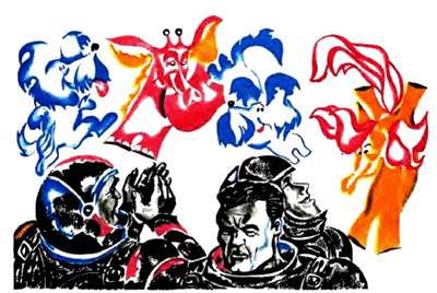 Помощник Морена и космонавт Флинн шли сквозь рощу. Над ними, весело щебеча, парили, переносясь с места на место, красно-золотые птицы. Ветер колыхал высокую траву и мелодично гудел в ветвях деревьев. Трое странных туземцев шли по их следу. Внешне они не отличались от лошадей, но имели зеленую с белыми горошинами шкуру. Наконец роща кончилась, и они оказались у подножия холма.
