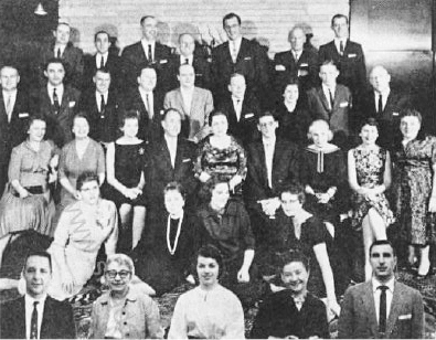 Коллектив McDonald’s на первом общекорпоративном рождественском вечере в 1958 году. Передний ряд (слева направо): Джон Горн, Лилиан Макмагон, Сыо Стейнбах, Хелен Шелби, Рэй Червински. Второй ряд: Гертруда Джекобе, Элен Буш, Нэнси Дженкинс, Карен Мур. Третий ряд: Глория Бэрр, Хей-зен Стриплинг, Мэри Энн Сам-минс, Рэй Крок, Джун Мартино, Гарри Соннеборн, Айдемей Кейз, Дороти Браун и Трудел Молайтер. Четвертый ряд: Дон Конли, Тони Фелкер, Джон Райс, Алекс Пыокало, Ник Кей-рос, Том Кейзи, Мириам Кэн, Ричард Бойлан, Роберт Л айветт. Пятый ряд; Фред Тернер, Барри Фрид, Ралф Бауэне, Джеймс Шиндлер, Роберт Пэпп, Кеннет Уиттон, Джон Хэрен.