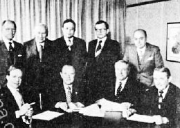 Слева: Наша повзрослевшая «шайка» – Боб, Лорэн и я – у входа в главный офис Фонда Крока. Внизу: совет директоров McDonald’s, февраль 1977 года. Сидят (слева направо): Фред Тернер, Рэй Крок, Эд Шмидт и Дик Бойлан. Стоят: председатель правления American National Bank & Trust Ален Стулц, бизнес-консультант и бывший президент сети кинотеатров Balaban & Katz Дон Любин, старший вице-президент Quaker Oats Боб Тэрстон и Герри Ньюмен.