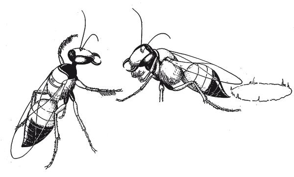 “Входящая” оса не слишком часто сталкивается с осой, которая вырыла нору, но если они все же встречаются, то вступают в бой, и проигравшая обычно спасается бегством, оставляя победительницу единоличной хозяйкой всех кузнечиков, собранных обеими осами. Предположительно, осы борются, чтобы определить, кому достанется нора, представляющая ценность для обеих. Ценность норы больше, когда в ней много кузнечиков, и логично предположить, что ценность будет одинакова для обеих ос независимо от того, кто наловил кузнечиков. Так что, если осы ведут себя как рациональные, а не “конкордовские” экономисты, следует ожидать, что за нору, полную провизии, обе будут сражаться яростнее, чем за скудно снабженную.
