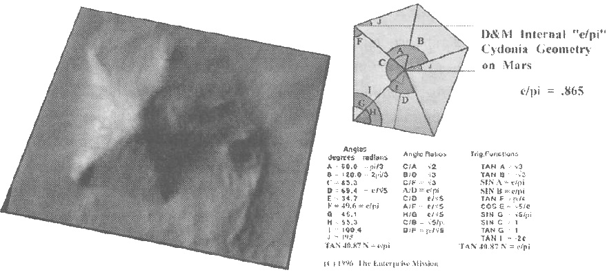 Торан также обнаружил, что широта восстановленной вершины Д и М составляла 40,868°, что близко соответствовало арктангенсу отношения е/π. Торан сделал вывод, что для любого, кто изучал эту структуру, это было ключом к доказательству ее искусственного происхождения. Такая самоотносимая численная связь, по его мнению, не могла возникнуть просто так. «Д и М» расположены «в нужном месте» на поверхности Марса.