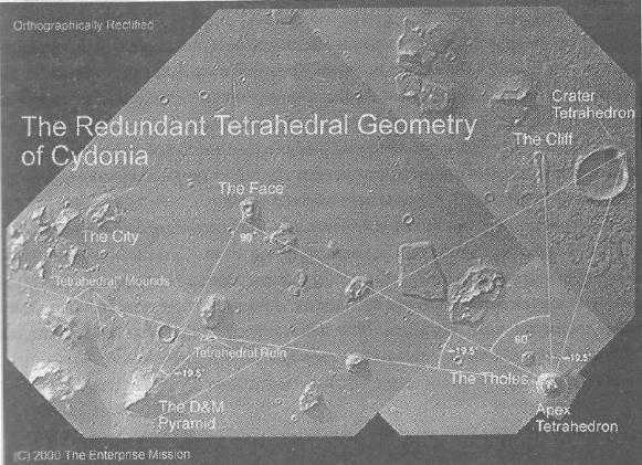 Эта «тетраэдральная» идея получила подтверждение, когда ученые вернулись к оригиналам снимков Сидонии. Некоторые из небольших холмов, ранее замеченные Хоглендом, имели вид тетраэдральной пирамиды, а Пирамида Кратера, к которой обращались во время проведения измерений, связанных с углом 19,5°, также оказалась четырехгранной. Сами холмы были расположены так, что образовывали две группы равносторонних треугольников – двумерную фигуру основания тетраэдральной пирамиды.