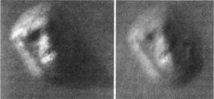 Рис. 1-2. Лицо, снимки НАСА, сделанные «Викингом», 35А72 (слева) и обработанные д-ром Марком Карлотто 70А13 (справа).