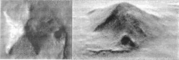 Рис. 1-3. Два вида пентагональной Пирамиды «Д и М» на снимке «Викинга» 35А72.Вид сверху (слева) и трехмерный вид в перспективе – Карлотто (справа).