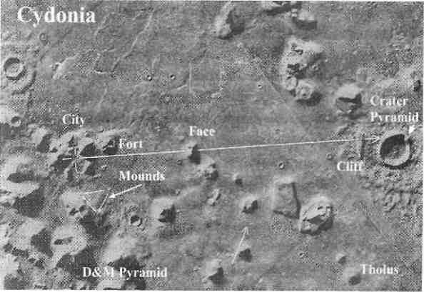 равноудаленных холмов с прямым видом на Лицо), «Крепость» (объект за Городом», который имеет треугольную форму и две прямые стены), «Купол» (круглый холм, который очень похож по форме и расположению – вплоть до «рва» вокруг него – на холмы на Земле, в Англии), «Отвесная Стена» (длинный, почти идеально прямой гребень, с чем-то вроде платформы, построенной над склоном близлежащего кратера, образовавшегося от удара метеорита) и «Пирамида кратера» (четырехгранный пирамидальный холм, каким-то образом помещенный на ребре кратера) вошли в так называемый «Комплекс Сидонии» (рис. 1-4).