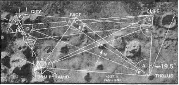 Получив исследования Торана, Хогленд быстро понял, что они находятся на пороге важного открытия. Если числа Торана будут повторяться во всем комплексе Сидонии, если такие же углы и пропорции имеются в более широких соотношениях между уже открытыми потенциальными «монументами», – тогда у них есть очень сильный аргумент в пользу того, что модель Торана верна. Производя измерения исключительно между очевидными деталями – вершинами Купола и «Д и М», прямой линией Отвесной Стены, центра Города и вершиной пятигранного Кратера пирамиды, Хогленд обнаружил, что многие из таких углов, пропорций и функций применимы ко всему комплексу Сидонии (рис. 1-8).