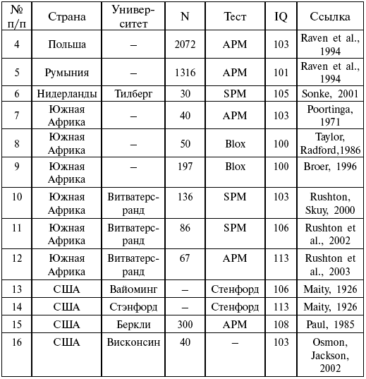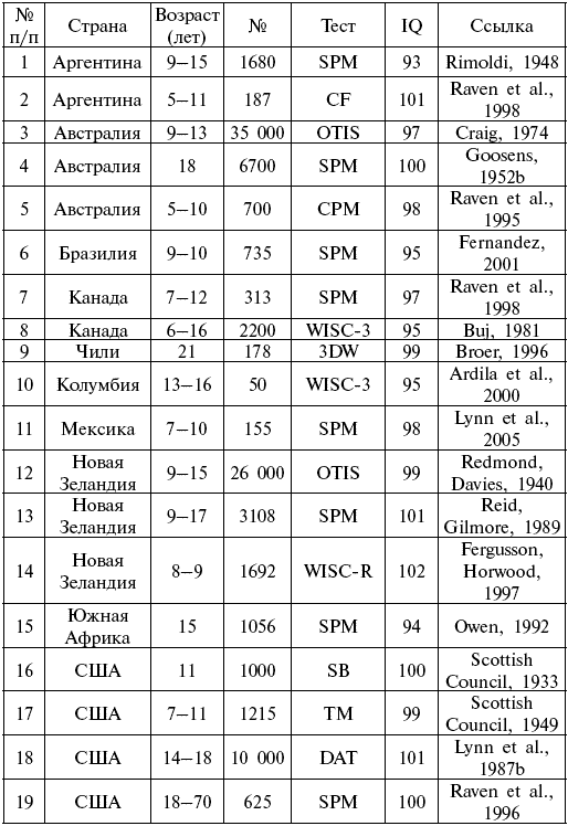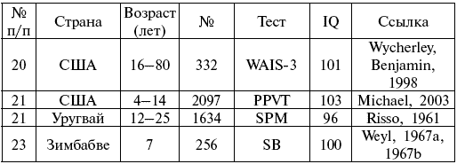 В строке 9 представлен IQ в 99 балла для Чили, основанный на исследовании среди европеоидных студентов Католического университета г. Вальпараисо, показавшего, что их IQ не отличается от IQ австрийских студентов (n = 320). В строке 10 представлен IQ в 95 баллов для европеоидных детей в Колумбии. В строке 11 приведен IQ 98 для европеоидных детей в Нижней Калифорнии в Мексике. В строке 12 представлен IQ в 99 баллов для Новой Зеландии, полученный из стандартизации теста Отиса в 1930-х гг. Строка 13 дает величину IQ в 101 балл, полученную из стандартизации прогрессивных матриц. Строка 14 дает IQ 102, определенный в исследовании детского развития, выполненного христианской церковью. Строка 15 дает IQ 94 для 16-летних европеоидных детей в Натале в Южной Африке. В строках с 16 по 21 дано шесть значений величины IQ в диапазоне от 99 до 103 баллов для европеоидов в Соединенных Штатах, в сравнении с соответствующими значениями в Великобритании. Величина IQ в 100 баллов, приведенная в строке 20, выведена из стандартизации теста WAIS-3 в Великобритании. В строке 22 приведен IQ 96 из стандартизации прогрессивных матриц в Уругвае. В строке 23 дан IQ в 100 баллов для европеоидных 7-летних детей в Зимбабве.