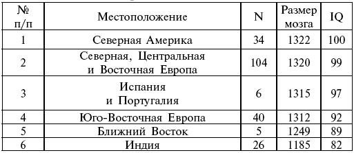 Из строки 1 видно, что у европеоидов в Северной Америке наибольшие размер мозга и IQ. Как видно в строке 2, за ними следуют европеоиды Северной, Центральной и Восточной Европы. В строке 3 представлены немного более низкие значения размера мозга и величины IQ в Испании и Португалии. Как видно из строки 4, объем мозга и величина IQ в Юго-Восточной Европе еще меньше. Строка 5 показывает дальнейший нисходящий тренд размера мозга и величины IQ на Ближнем Востоке, измеренный на выборках выходцев из Южной Азии (из Турции и Ирака). В строке 6 приведены самые низкие значения размера мозга и IQ выходцев из Южной Азии (в Индии). Детально величины IQ аборигенов Южной Азии в Турции, Ираке и в Индии рассматриваются в Главе 6.