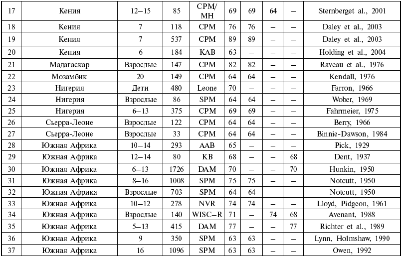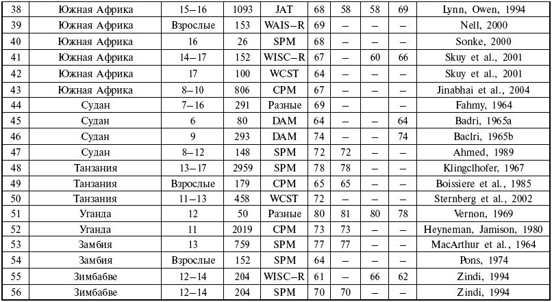 В строках 26 и 27 даны IQ в 64 балла для двух выборок взрослых в Сьерра-Леоне. В строке 28 приведен IQ в 65 баллов, полученный в первом исследовании интеллекта африканцев в Южной Африке, проведенном в 1920-х гг. В строках 29–40 даны оценки IQ в диапазоне от 58 до 77 баллов, полученные в двенадцати более поздних исследованиях. В строке 34 дан IQ 71 для тюремных надзирателей, имевших 9–12-летнее образование. В строке 35 приведен IQ в 77 баллов, который является самым высоким для ощепопуляционных выборок в Африке южнее Сахары, но он был получен с помощью теста «нарисуй человека», который является довольно плохим тестом общего интеллекта. В строке 38 представлен IQ 58 для большой выборки 16-летних школьников-африканцев, имевших примерно десятилетнее образование. Результаты сравнивались с южноафриканскими европеоидами. В строке 39 приведен IQ 69 для группы взрослых испытуемых, описанных как «компетентные мужчины, работающие длительное время в сложной среде…» (Nell; 2000, с. 27). В строке 40 дан IQ 68 для подростков с несколькими годами школьного обучения из Северного Трансвааля. В строках 41 и 42 даны IQ 67 и 64 для двух выборок подростков из школ г. Соуэто. В строке 43 приведен IQ в 67 баллов для школьников третьего класса – зулусов из Наталя.