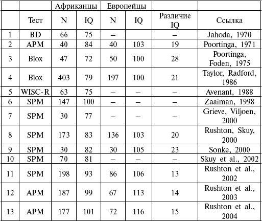 В строке 1 представлен IQ в 75 баллов для африканцев – студентов университета Легон в Гане, полученный с помощью методики «Кубики Кооса» из теста Векслера. Во всех остальных строках приведены результаты для Южной Африки. В строке 2 даны IQ в 84 балла для африканских и в 103 балла для европейских университетских студентов, вычисленные относительно американских норм для взрослых, опубликованных в работе Равена, Курта и Равен (Raven, Court, Raven; 1994). В строках 3 и 4 приведены результаты студентов по тесту Блокса (Blox), показатели IQ африканцев представлены в сравнении с показателями европеоидных южноафриканских студентов, принятыми за 100 баллов. Строка 5 дает результаты тестирования с помощью теста WAIS-R студентов (средний возраст 25 лет) в африканских университетах Форт Харе, Зулуленд, Северный и Медицинского университета Южной Африки. Вербальный IQ составил 78, IQ достижений – 73 балла, что еще раз показывает, что африканцы имеют низкий IQ по всем основным познавательным способностям, и противоречит иногда высказываемому утверждению о том, что африканцы испытывают затруднения в выполнении языковых задач. В строке 6 приведен IQ в 100 баллов для студентов научных специальностей из Северного университета. В строке 7 дан IQ 77 для студентов менее престижного африканского университета. В строке 8 представлен IQ в 83 балла для студентов университета Витватерсранда и университета Африкаанс Ранда в Йоханнесбурге. В строке 9 представлен IQ 82 для африканских студентов из университета Венда в Северном Трансваале. Европейская группа, результаты тестирования которой используются для сравнения, была из университета Тилберга в Нидерландах. В строке 10 дан IQ 81 для студентов-психологов из университета Витватерсранда. В строке 11 представлен IQ 93 для студентов-первокурсников инженерных специальностей из университета Витватерсранда. В строке 12 дан IQ 99 для немного уменьшенной группы тех же студентов, оцененный 16 месяцев спустя с помощью прогрессивных матриц повышенной сложности. И африканцы, и европейцы показали результаты приблизительно на 6 баллов выше при втором тестировании, вероятно, вследствие тренировки. В строке 13 приведен IQ в 101 балл для другой выборки студентов-африканцев инженерных специальностей из университета Витватерсранда; видно, что африканские студенты имели IQ на 15 баллов ниже, чем белые европейцы.