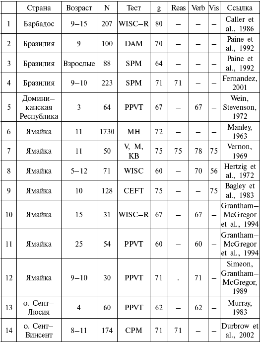 В строке 1 дан IQ 80 для детей на Барбадосе. Это значение, как сообщается в исследовании, было вычислено из значения IQ в 83 балла для хорошо питавшихся и в 68 баллов для голодавших детей с учетом показателя преобладания умеренного и серьезного недоедания дошкольников на Барбадосе (16,5 % – по данным обследования 1968 г. (см. Galler, Ramsay, Solimano et al., 1983). В строке 2 дан IQ 70 для африканцев в Бразилии, посещавших школу в фавеле (трущобный район) в г. Бразилиа. В строке 3 дан IQ 64 для матерей этих детей. В строке 4 дан IQ 71 для африканцев в г. Сан-Паулу в Бразилии. В строке 5 представлен IQ 67 для 3-летних африканских детей из Доминиканской Республики. Низкий IQ этих младенцев дает основание предполагать, что плохое образование не является фактором, ответственным за низкие величины IQ африканцев с островов Карибского бассейна. В строках 6–12 приведены результаты семи исследований IQ на Ямайке, давших оценку в диапазоне 60–75 баллов с медианой 67. В строке 13 дан IQ 60 для 4-летних детей с о. Сент-Люсия, а в строке 14 – IQ 70 для детей с о. Сент-Винсент. Медиана оценок четырнадцати исследований интеллекта африканцев с островов Карибского бассейна и из Латинской Америки составила 71 балл IQ. Это немного выше, чем средний IQ африканцев в Африке южнее Сахары, составляющий 67 баллов. Возможное объяснение этого в том, что у африканцев островов Карибского бассейна и Латинской Америки есть некоторая примесь европейских генов. Как было оценено, доля европейских генов в африканском населении Ямайки составляет 6,8 % (Parra, Marcini, Akey, 1998).