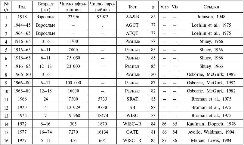 В строке 1 даны результаты первого из больших исследований – среди призывников в период Первой мировой войны, проводившегося с помощью объединенных армейских альфа– и бета-тестов, которые измеряли невербальный и вербальный IQ и впоследствии легли в основу тестов Векслера. Число европеоидов составляло 93 973 чел. В строке 2 приведены данные для призывников Второй мировой войны, а в строке 3 – результаты тестирования призывников вьетнамской войны. Примечательно, что средний IQ африканцев в периоды Второй мировой и вьетнамской войн был ниже (77 баллов), чем в период Первой мировой войны, и ниже обычно приводимого среднего значения IQ афроамериканцев в Соединенных Штатах (85 баллов). В строках 4–7 приведены результаты компиляции всех американских исследований, выполненной Шу. В строке 4 дан IQ 87, полученный по данным 17 исследований среди дошкольников. В строке 5 представлен IQ 85, определенный по результатам 26 исследований среди учащихся начальной школы с использованием индивидуальных тестов, таких как тест Стенфорд-Бине. В строке 6 приведен IQ 85 для учащихся начальной школы, полученный по 103 исследованиям с применением тестов вербальной способности и 41 исследованию с помощью тестов невербальной способности. В строке 7 дан IQ 85 для студентов высшей школы. В строках 8, 9 и 10 представлены результаты Осборна и МакГурка (Osborne, McGurk, 1982), дополнивших суммарные данные американских исследований результатами работ, опубликованных в период 1976–1980 гг. В строке 8 дан IQ 80, полученный из результатов 66 исследований среди дошкольников 3–5 лет. В строке 9 приведен IQ 87, полученный по данным 126 исследований среди учащихся начальной школы, а в строке 10 – IQ 87, полученный по данным 17 исследований среди учащихся средней школы.