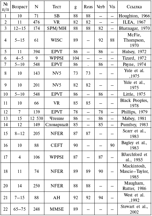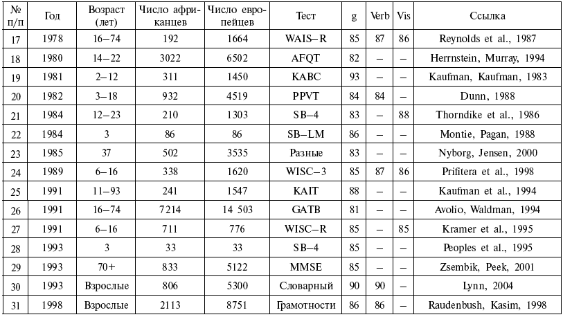 В строках 11, 12 и 13 (Broman et al.; 1975) даны результаты тестирования трех больших выборок испытуемых, не представленных в обзоре Осборна и МакГурка. В строке 11 приведен IQ в 85 баллов для африканских матерей, тестировавшихся в ходе выполнения Национального коллаборативного перинатального проекта, а в строках 12 и 13 – IQ их детей в возрасте 4 и 7 лет, составивший 87 баллов. В строке 14 представлен IQ общего интеллекта африканцев в 86 баллов по данным выборки стандартизации теста WISC-R. В строке 15 дан IQ в 81 балл для общего интеллекта, в 86 баллов для вербального интеллекта и в 84 балла для способности к визуализации среди работающих по найму (данные собраны Службой занятости Соединенных Штатов). В строке 16 дан IQ 85 для общего интеллекта афроамериканцев, 87 для вербального и 86 для способности к визуализации по выборке из Калифорнии. В строке 17 приведен IQ 85 для общего интеллекта, 87 для вербальной способности и 86 для способности к визуализации (по данным выборки стандартизации теста WAIS-R). В строке 18 представлен IQ 82, полученный с помощью теста AFQT. В строке 19 дан IQ 93 по данным выборки стандартизации теста K-ABC. В строке 20 дается словарный IQ в 85 баллов по данным выборки стандартизации словарного теста Пибоди в картинках. В строке 21 представлен IQ в 83 балла, полученный по данным выборки стандартизации теста Стенфорд-Бине-4. Афроамериканцы из этой выборки получили IQ для кратковременной памяти в 89 баллов, что согласуется с результатами многих других исследователей, согласно которым афроамериканцы сравнительно успешно выполняют тесты на кратковременную память. В строке 22 дан IQ 85 для 3-летних детей по данным выборки стандартизации теста Стенфорд-Бине-LM. В строке 23 приведен IQ 83, вычисленный из значений первого главного фактора как меры общего интеллекта, полученных у военнослужащих. В строке 24 представлен IQ 85 по данным выборки стандартизации теста WISC-3. В строке 25 дан IQ 88 по данным выборки стандартизации теста интеллекта Кауфмана для подростков и взрослых. В строке 26 дан IQ 81 для выборки работающих по найму (данные собраны Службой занятости Соединенных Штатов). В строке 27 приведен IQ 85 для способности к визуализации из оценок субтеста упорядочивания блоков теста WISC-R (по данным национальной выборки NHANES III).