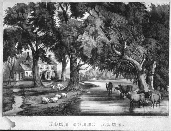 «Home Sweet Home», название этой гравюры Карриера и Айвза, было припевом популярной песни в ныне забытой английской опере. Она стала любимой песней солдат Союза и Конфедерации и отражает сентиментальный образ дома, который был так велик в викторианской культуре. Библиотека Конгресса США, LC-USZC2–2590.