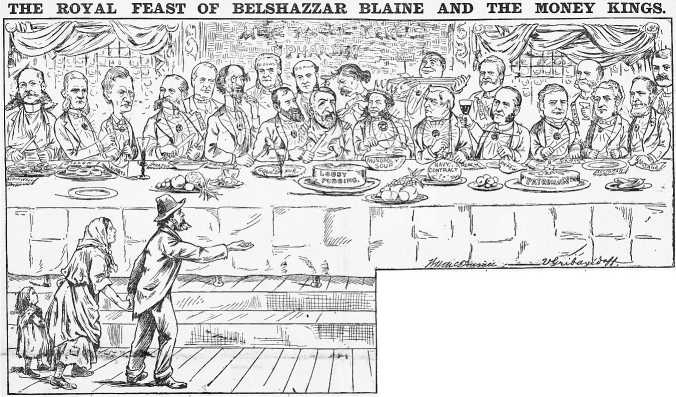 Карикатура Уолта Макдугалла «Королевский пир Белшаззара Блейна и денежных королей» появилась в журнале Джозефа Пулитцера New York World 30 октября 1884 года. Она высмеивала кандидата в президенты от республиканцев Джеймса Г. Блейна за посещение пышного банкета с плутократами в знаменитом нью-йоркском ресторане Delmonico’s. Бедная семья выпрашивает объедки. Библиотека и музей карикатур Билли Айрленда при Университете штата Огайо.