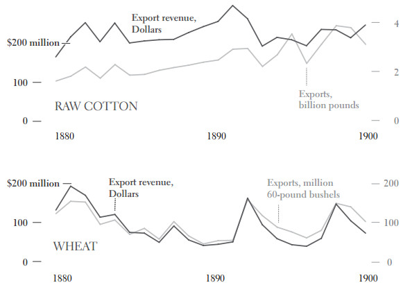 Нет необходимости признавать хлопок единственной причиной финансовых паник, чтобы утверждать, что неурожаи хлопка оказывали огромное дополнительное давление на финансовую систему США. При таком количестве предприятий, обремененных долгами, Генри Адамс ожидал «большого взрыва. Наш пузырь раздули до того, что он когда-нибудь лопнет; возможно, лучше сейчас, чем потом…» В 1892–93 годах сочетание ликвидации инвестиций европейцами и неурожая хлопка привело к резкому падению золотого запаса, удорожанию кредитов и сокращению инвестиций. Огромная нагрузка легла на перегруженную железнодорожную систему.[1854]1854