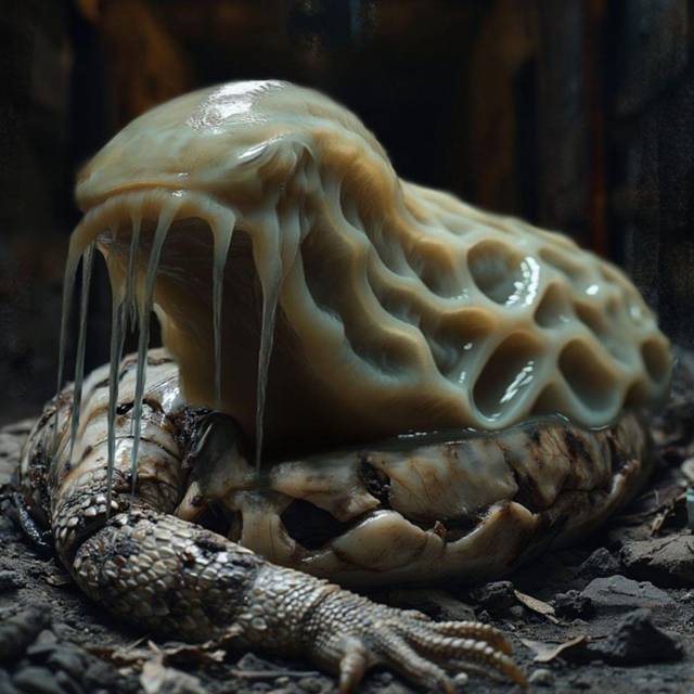 Полусъеденная тушка ящера, судя по размерам пятьдесят плюс, только вышел из детского возраста, голова отсутствует, её место занимает нечто чуждое и бесформенное.