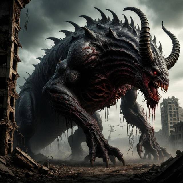 Я присмотрелся, из-за разрушенных строений, появилась здоровенная рогатая башка. За ней показалась туша, которая никак не хотела заканчиваться, тянулась и тянулась, словно гигантская цистерна. Если сопоставить с соседними строениями, с которыми я уже успел свыкнуться, тварь никак не меньше шести подъездной пятиэтажки и то не факт, туша ещё не закончилась.