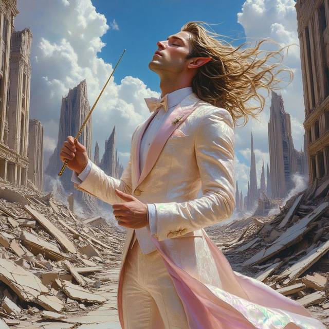 Эльф выглядел странно, начнём с того, что одет он во фрак кремово-перламутрового оттенка, узкие штаны, в руке дирижёрская палочка и он махал ей вверх, вниз, словно график рисовал.