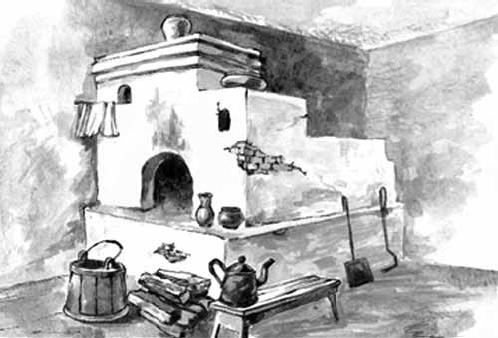 Русская печь – это необходимая часть каждой избы и в то же время самое громоздкое и неэффективное сооружение, какое можно себе представить. Во-первых, она очень велика и занимает почти четверть площади передней избы. Во-вторых, она не обогревает помещение. Ее стенки настолько толсты, что внутренний жар не прогревает их насквозь. В-третьих, в ней очень неудобно варить обычную еду. Ее топка находится глубоко от входного отверстия, поэтому требуются кочерга, чтобы задвигать в нее дрова, и ухват, чтобы вносить внутрь горшки с варевом.