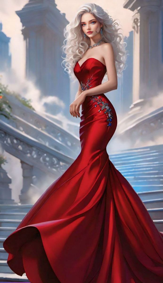 Алое платье, обтягивающее фигуру, подчеркивало каждую линию, будто было создано специально по моим параметрам. Ткань плавно облегала бедра, а затем раскатывалась в легкую волну у колен, добавляя образу загадочности и изысканности. Узор из камней, идущий от центра талии до середины левой стороны бедра, красиво сверкал при попадании света ламп, а каждый раз, когда я поворачивалась, ткань нежно шуршала.