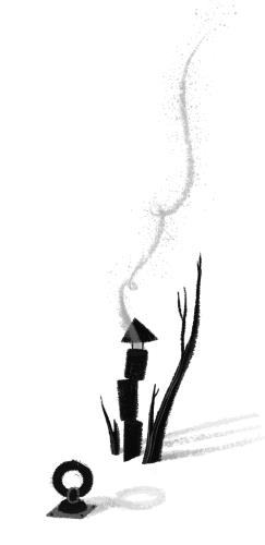 Пёсик вёл их на другой край долины за невысокий холм. Повернув за пригорок, они увидели тоненький столбик дыма из карандашной пыли, который струился из пенька на склоне холма. Штришок побежал туда. Подойдя ближе, они разглядели, что это не пенёк, а маленький дымоход. Рядом с ним виднелось большое тяжёлое металлическое кольцо, которое крепилось к маленькой плите, утопленной в снег.