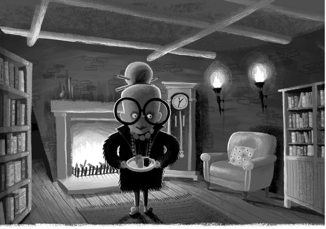 Орешек, Роквелл и Лялябет забрались в люк и следом за женщиной и Штришком спустились по лестнице. Они вошли в большую круглую комнату, которую освещали полыхающий в дальнем конце огонь и несколько пылающих факелов на стенах. Орешку почудилось, будто она оказалась внутри картины, написанной маслом. Куда ни взгляни, всюду виднелись мазки от кисточки. Они проступали в волокнах половиц, пробегали в рисунках подушек, вспыхивали в свете огня. И во всём здесь мерещилась лёгкая небрежность. Как будто тот, кто построил – или нарисовал – это место, придумывал на ходу, пока они шагали сюда, отчего комната сделалась обжитой, уютной. Орешку это очень понравилось.