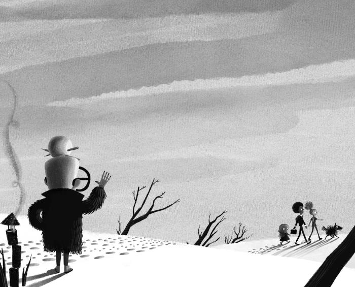 Штришок вёл троих детей через пустынные равнины Северного Контура на восток, к Чернильному району. Вдалеке вырастали из снега горы, нарисованные чёрным на фоне бледного неба. Следуя по линии, которую отметила точками на карте миссис М, группа держалась близко к границам города и двигалась прямиком к лесистой местности, известной как Набросковый лес.