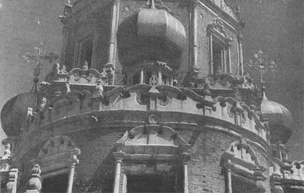 Главный восьмерик тоже завершен восемью главами на бочках. Между ними встроен второй восьмерик, снова оформленный четырьмя главами. На втором восьмерике воздвигнут третий, служащий основанием для барабана центрального купола – по счету двадцать первого. Еще одна, двадцать вторая, глава поставлена над алтарной частью, а с противоположной, западной, стороны устроено парадное крыльцо с красивыми лестницами и галереей-гульбищем.