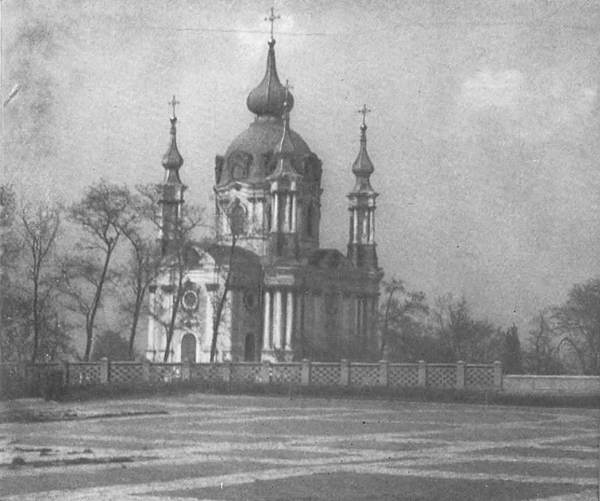 Охраняемый фундамент Десятинной церкви на Старокиевской горе. Здесь зародился стольный град Киев. За оградой – Андреевская церковь XVIII века (архитектор В. Растрелли).