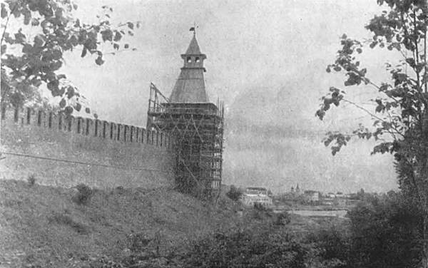Стены Новгородского кремля-детинца. Реставрируется Спасская башня. За Волховом виднеется Торговая сторона с Ярославовым дворищем.